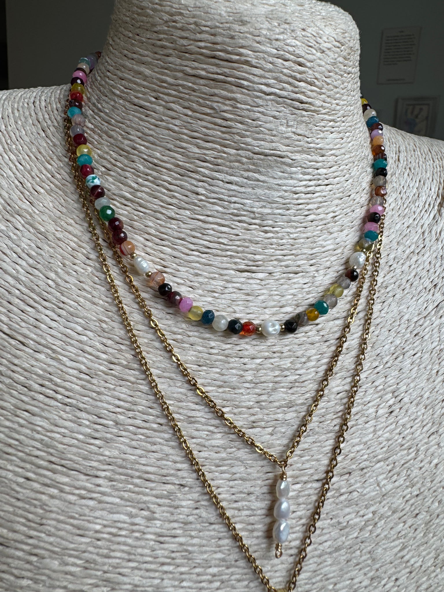 Semi precious stones. Fresh water pearls, stainless steel beads and section of 2”.