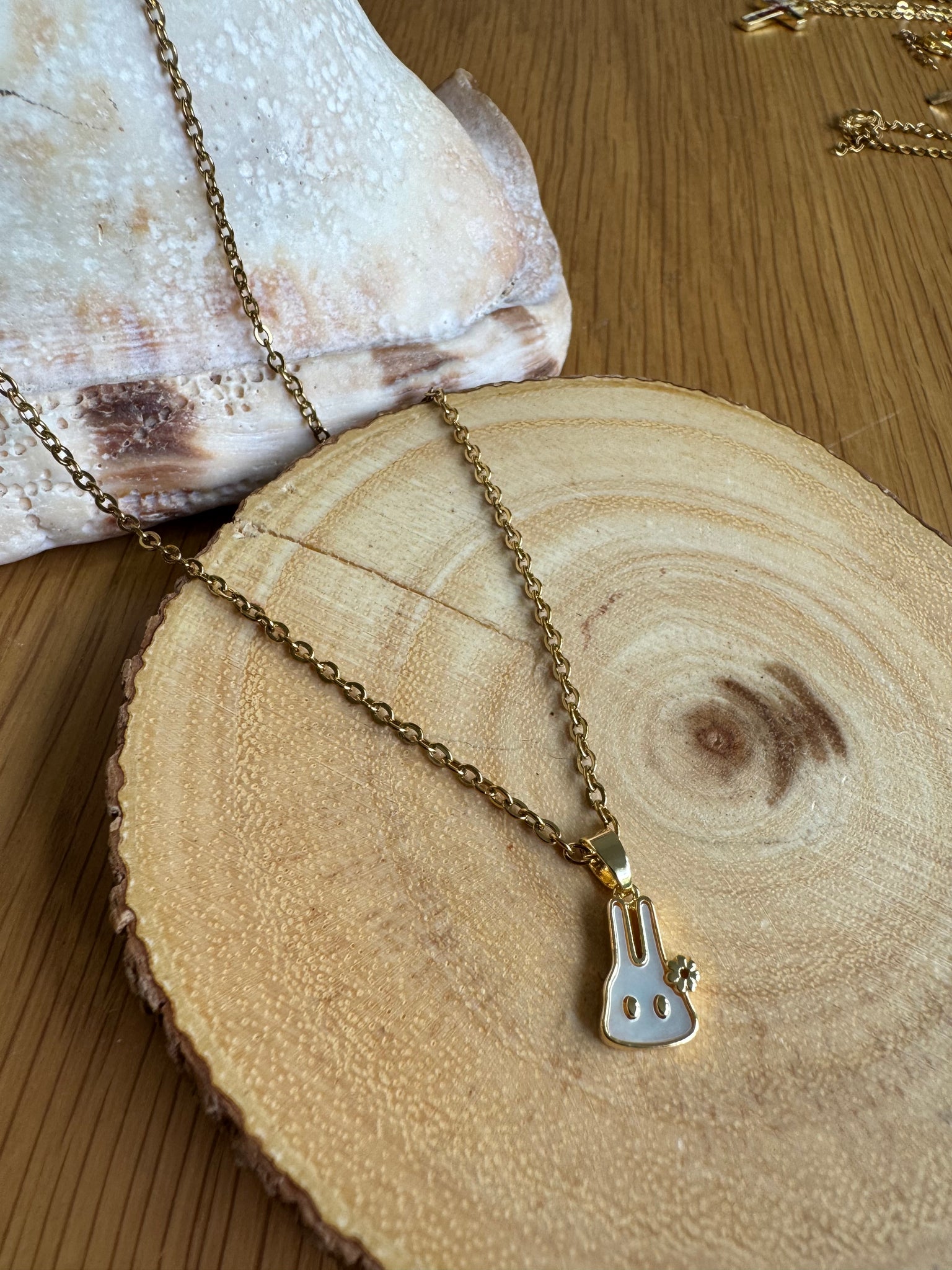 Mother of pearl bunny charm with stainless steel chain. 2” section.