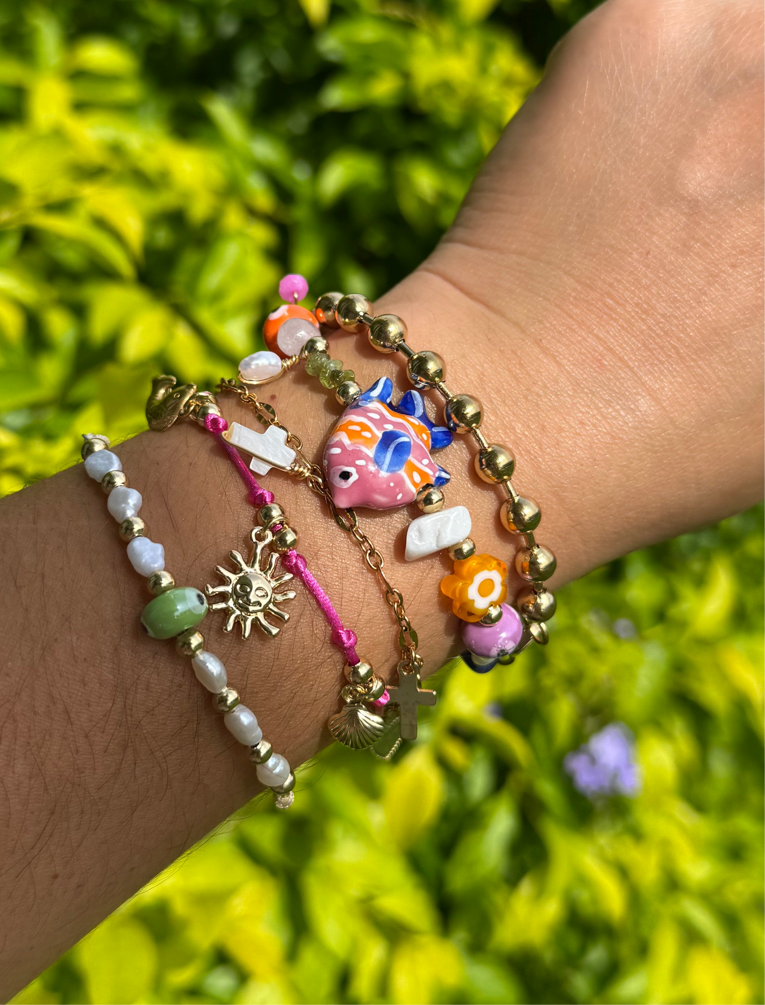 Adjustable. Ceramic. Fresh water pearls and semi precious stones. Stainless steel beads.