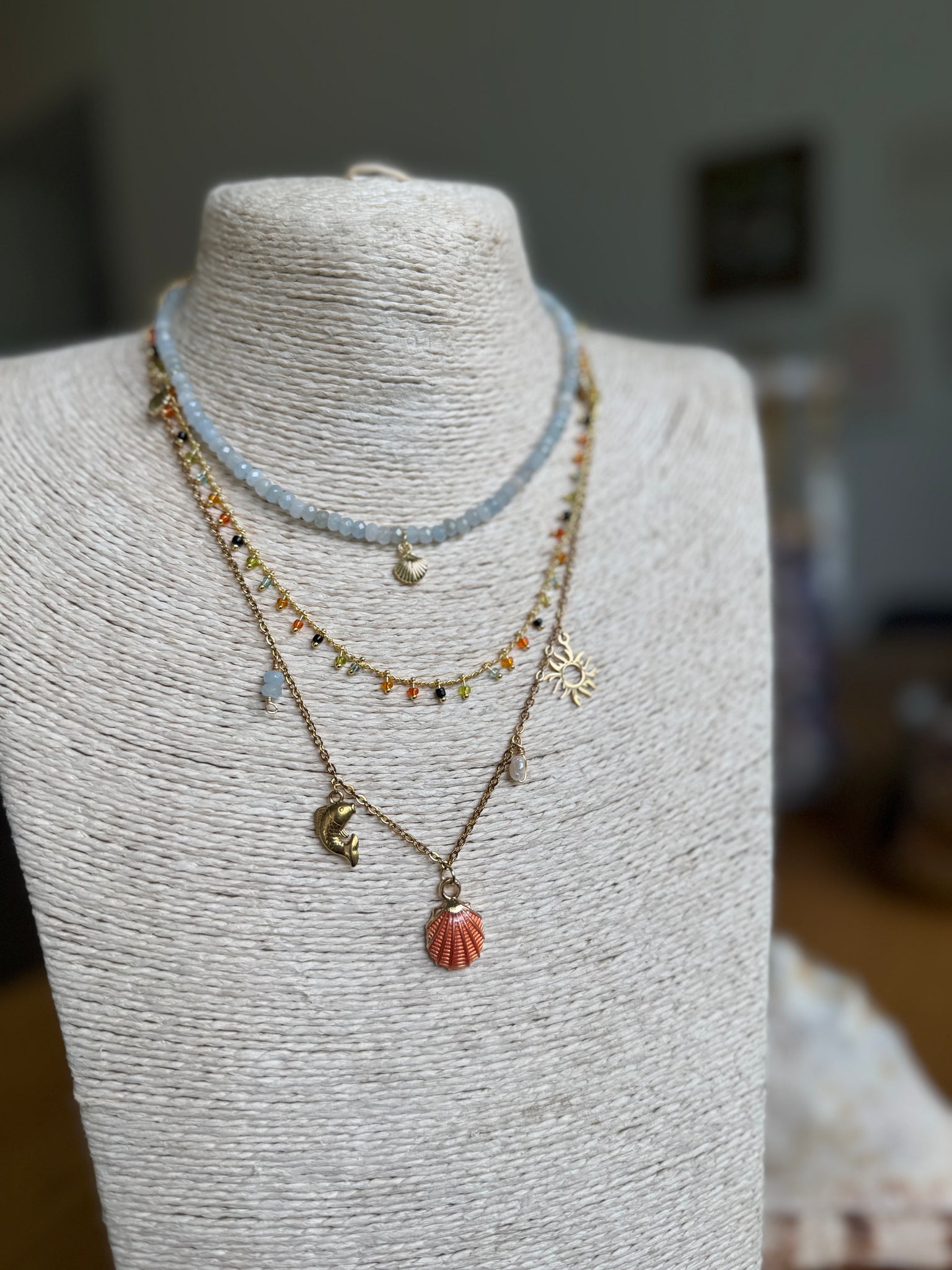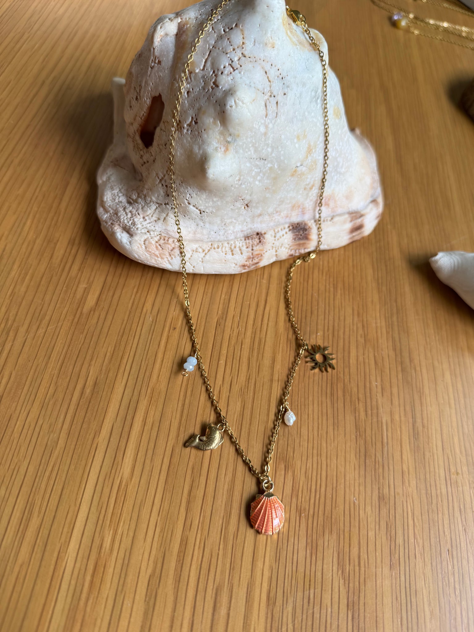 Stainless steel chain with stainless steel charms, fresh water pearls and jade stone. 2” section.