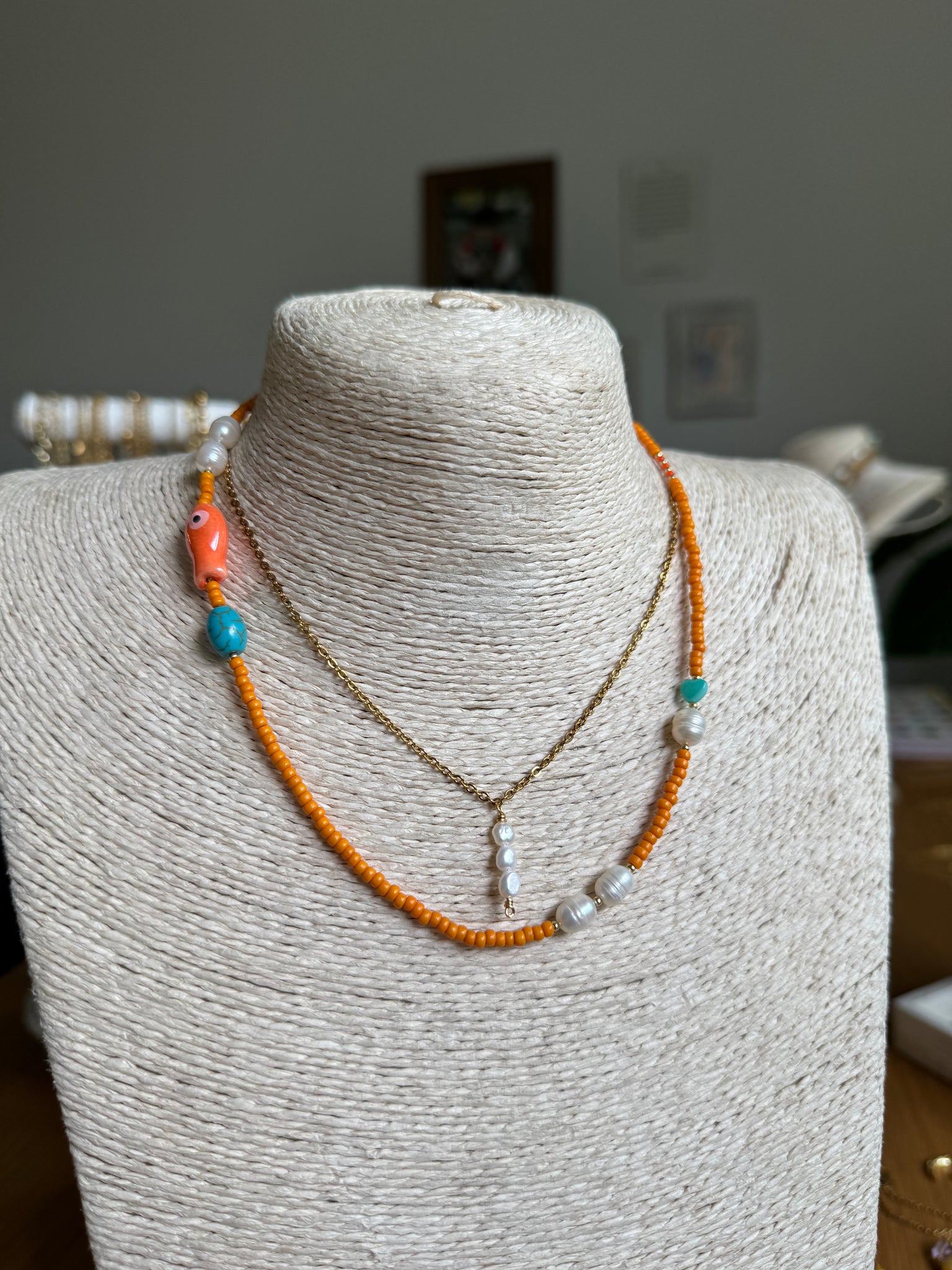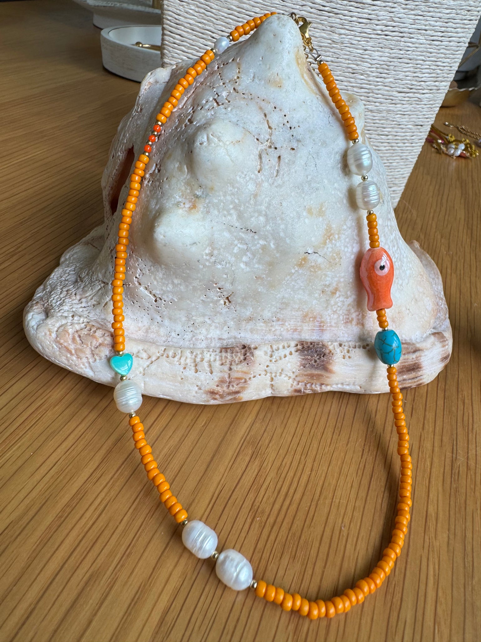 seed beads with fresh water pearls and shell beads. 2” section.