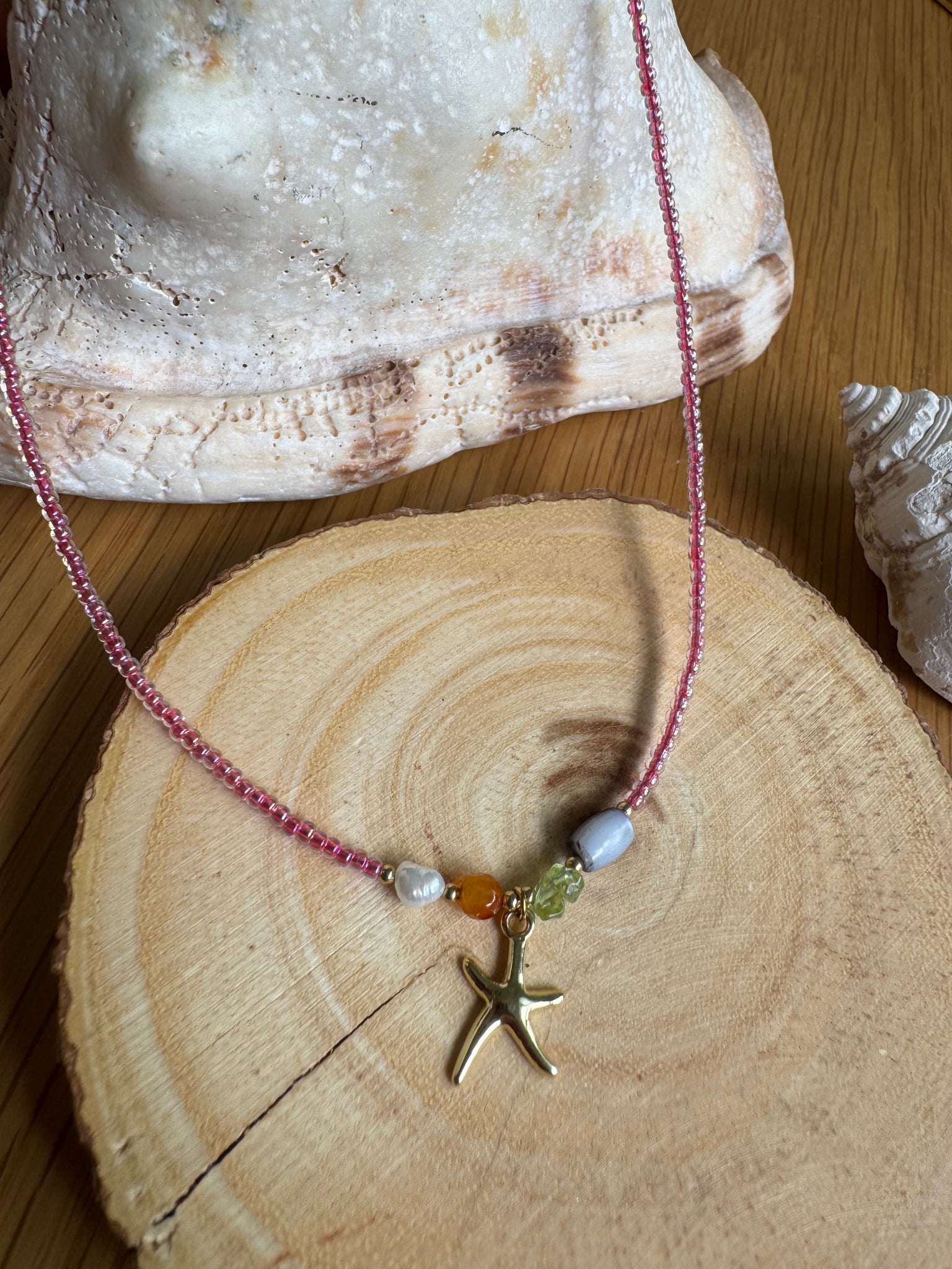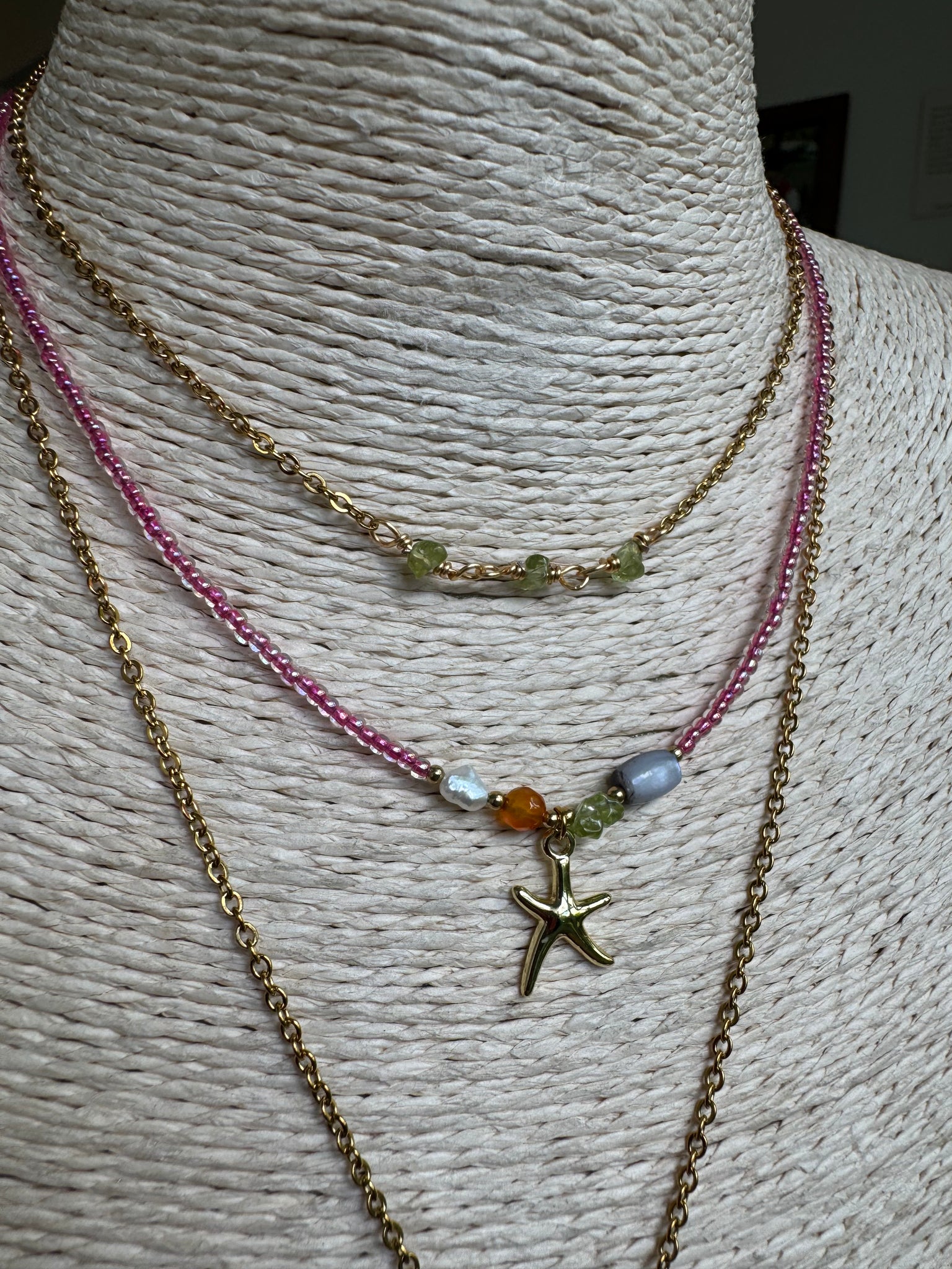Seed beads, semi precious stones. Stainless steel wire with 2” section.