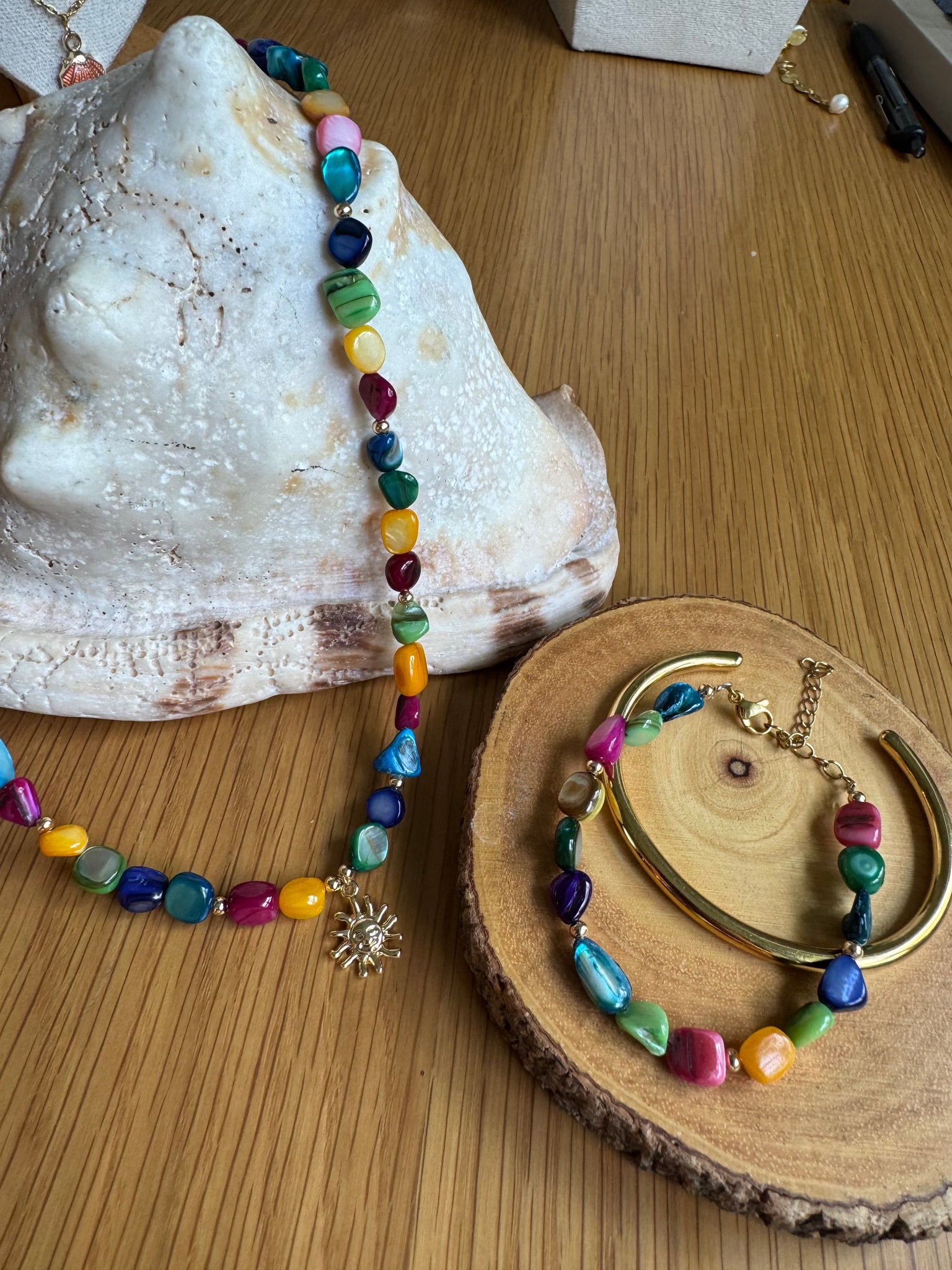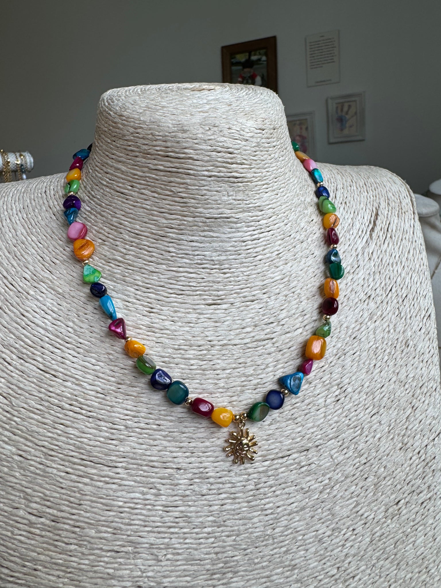 Natural shells, stainless steel beads, 2” section. Sun 18k plated.