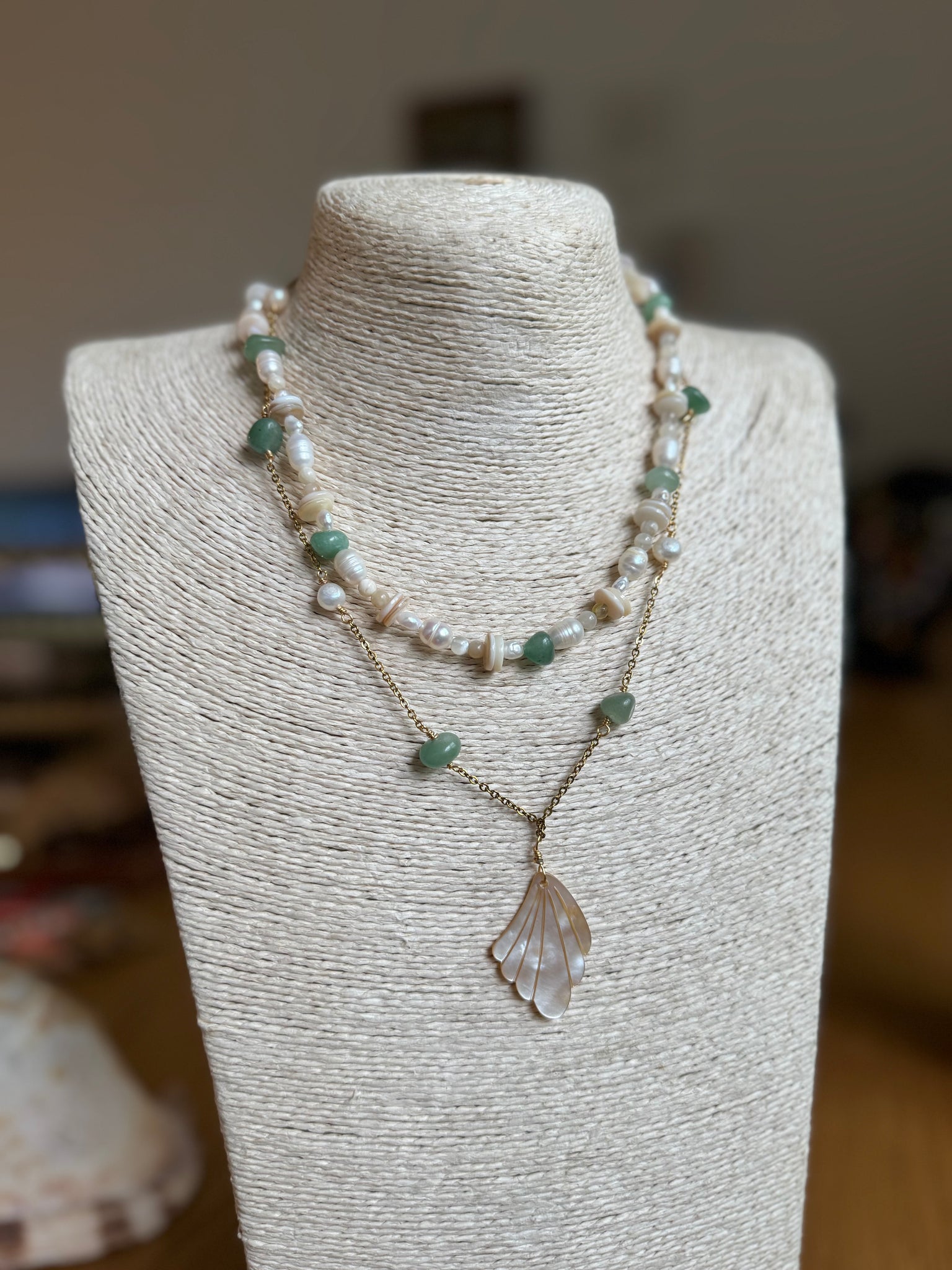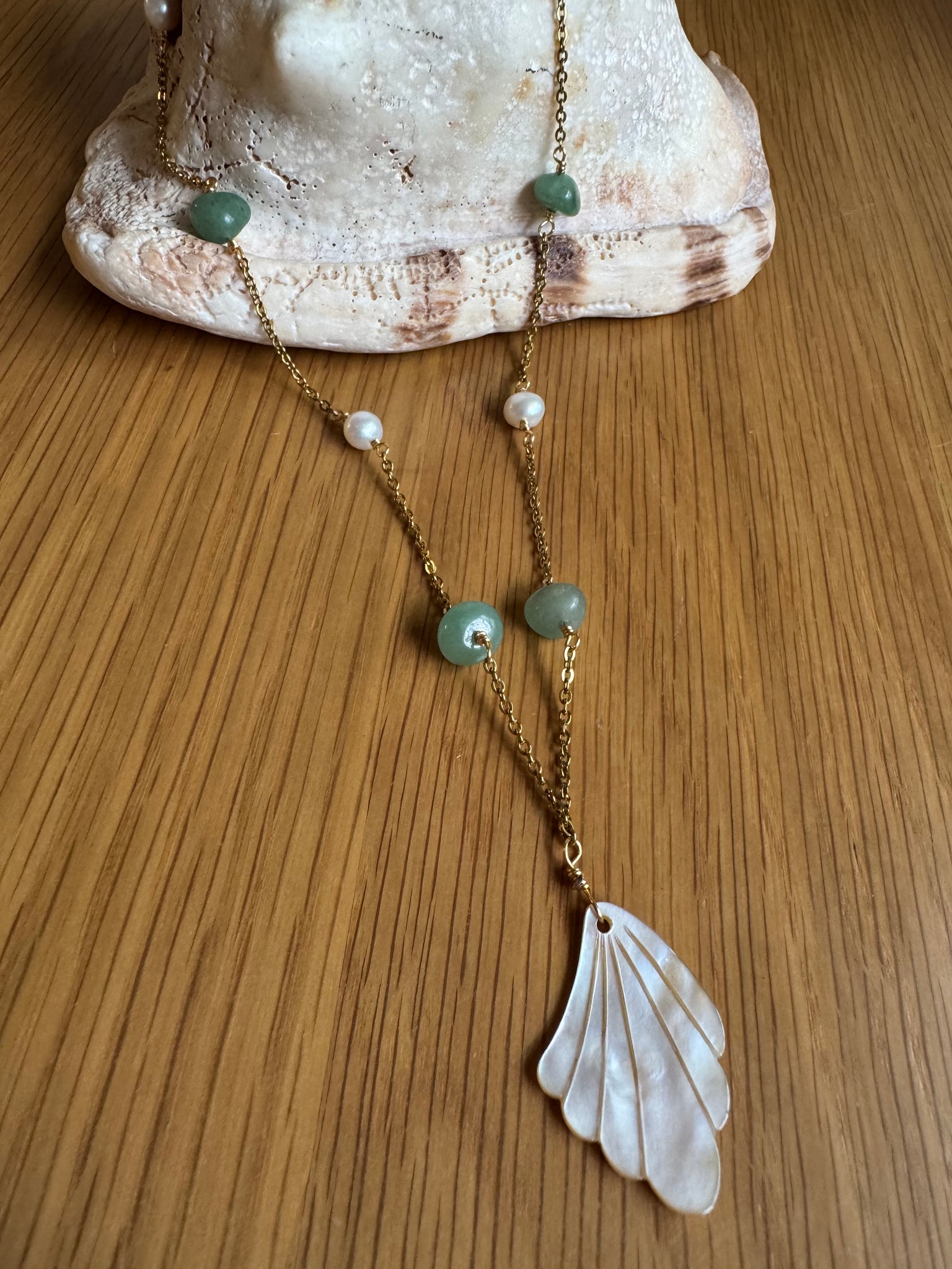 Stainless steel chain with natural pearls and jade stone. 2” section.