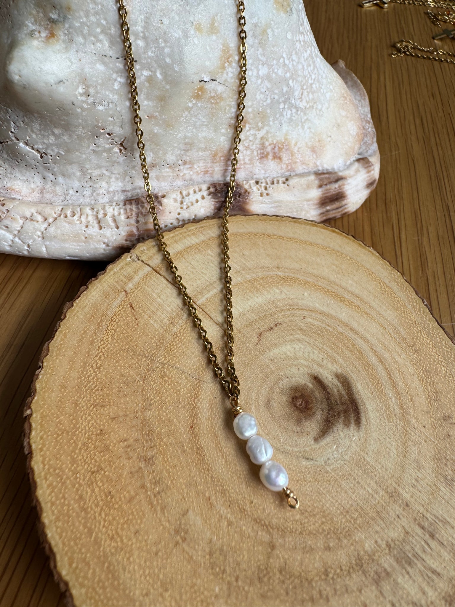 Fresh water pearls. Stainless steel chain and 2” section.