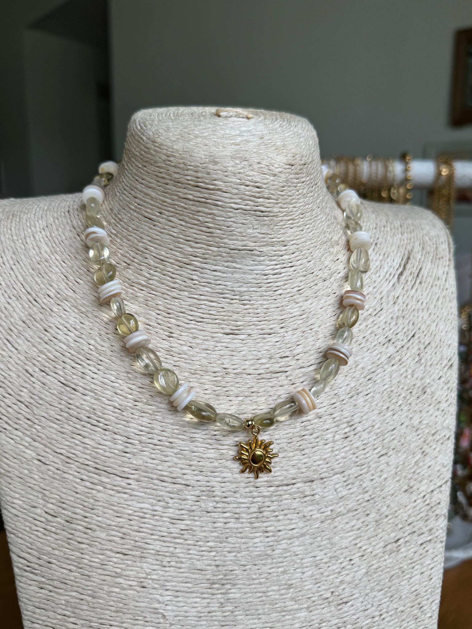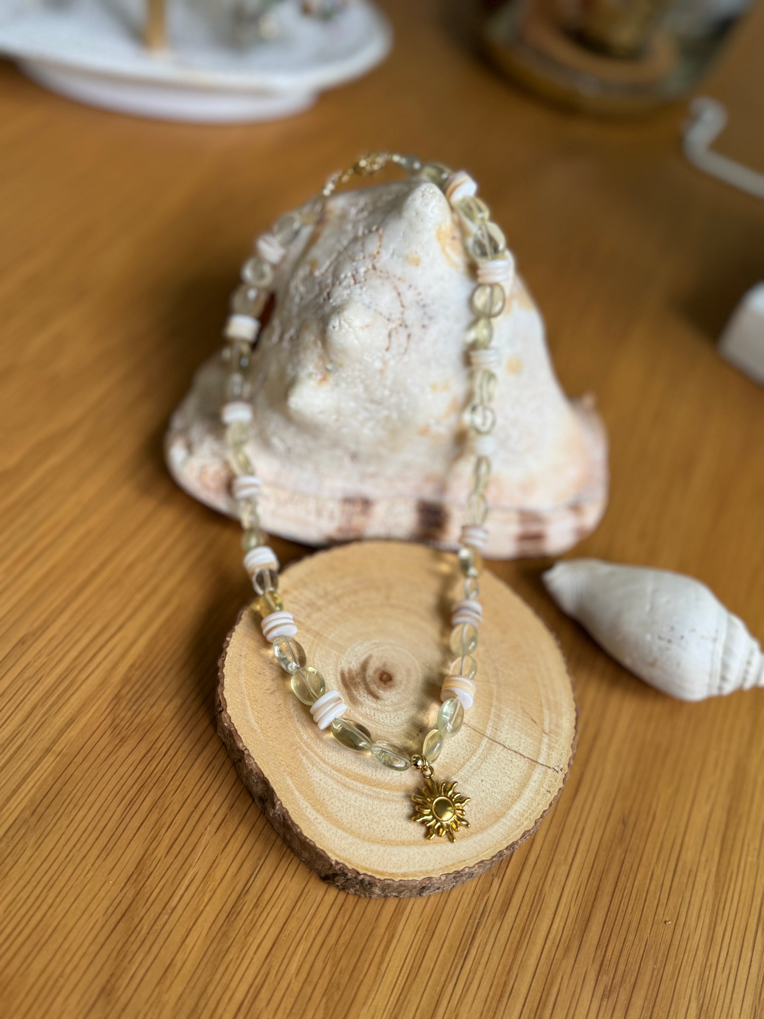 Stainless steel sun. Shells and lemon quartz stones. 2” Section.